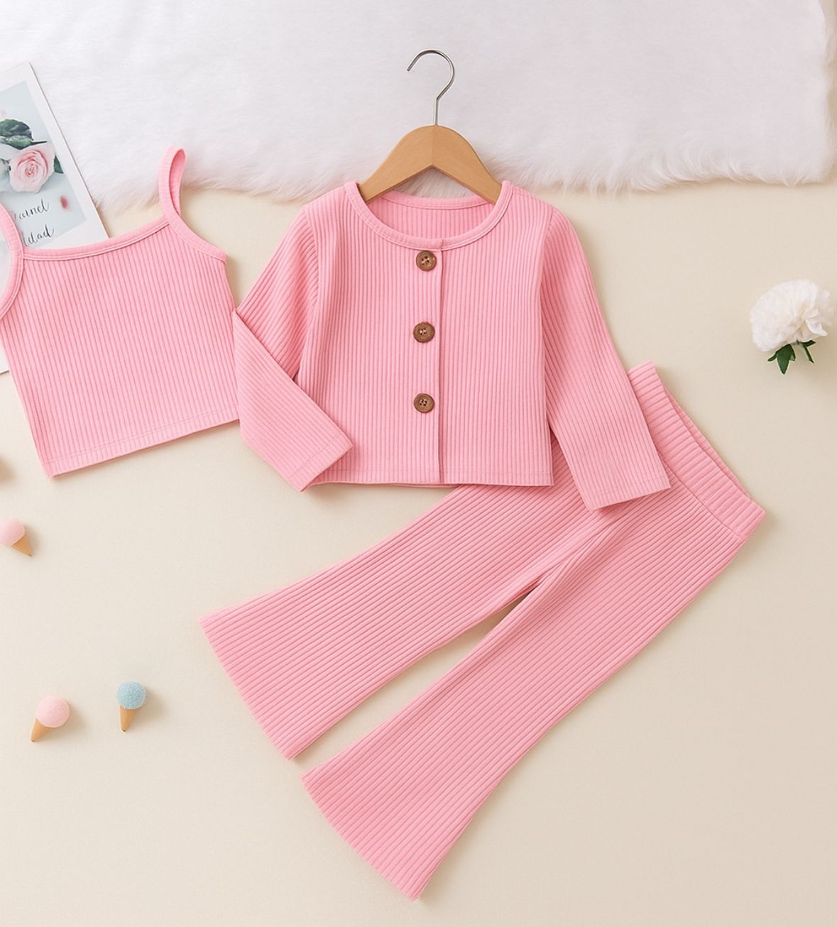 Your little princess will stay warm and look adorable in this 3-piece winter outfit, crafted from soft ribbed fabric in a charming blush pink shade. Designed for everyday wear with a cozy yet stylish look, it's the perfect winter essential for babies.