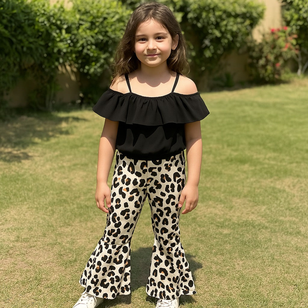 Baby girl black ruffle trim top with cheetah printed flare style pant - #SH-715