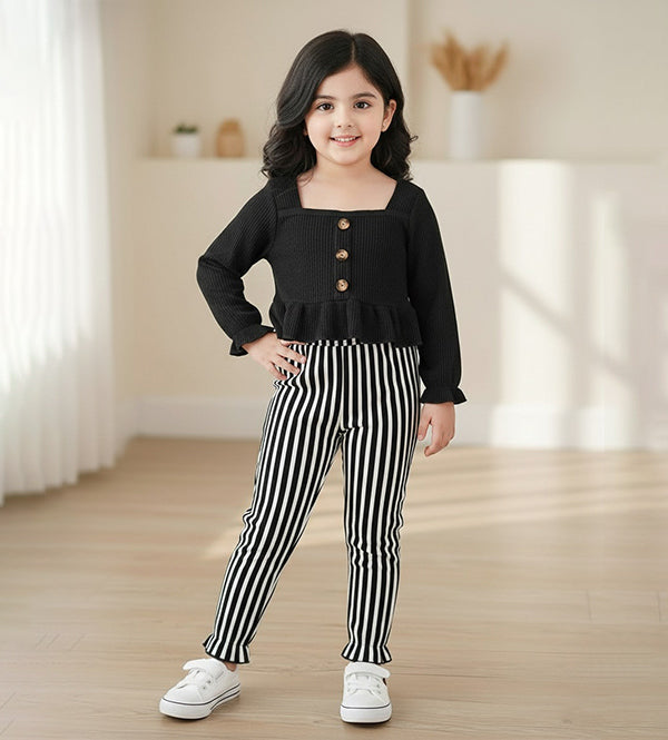 Apni baby girl ko dein ek classy aur trendy look is Baby Girl Stylish Black Stripe Outfit Set ke saath. Is smart 2-piece set mein elegant black ribbed top aur contrast stripe printed pant shamil hai, jo comfort aur style ka perfect balance offer karta hai.